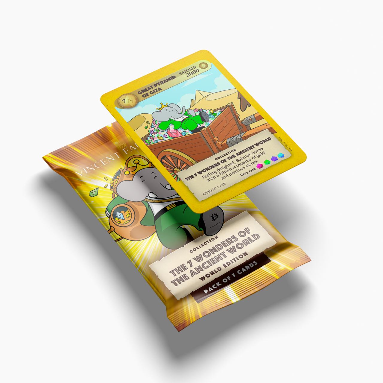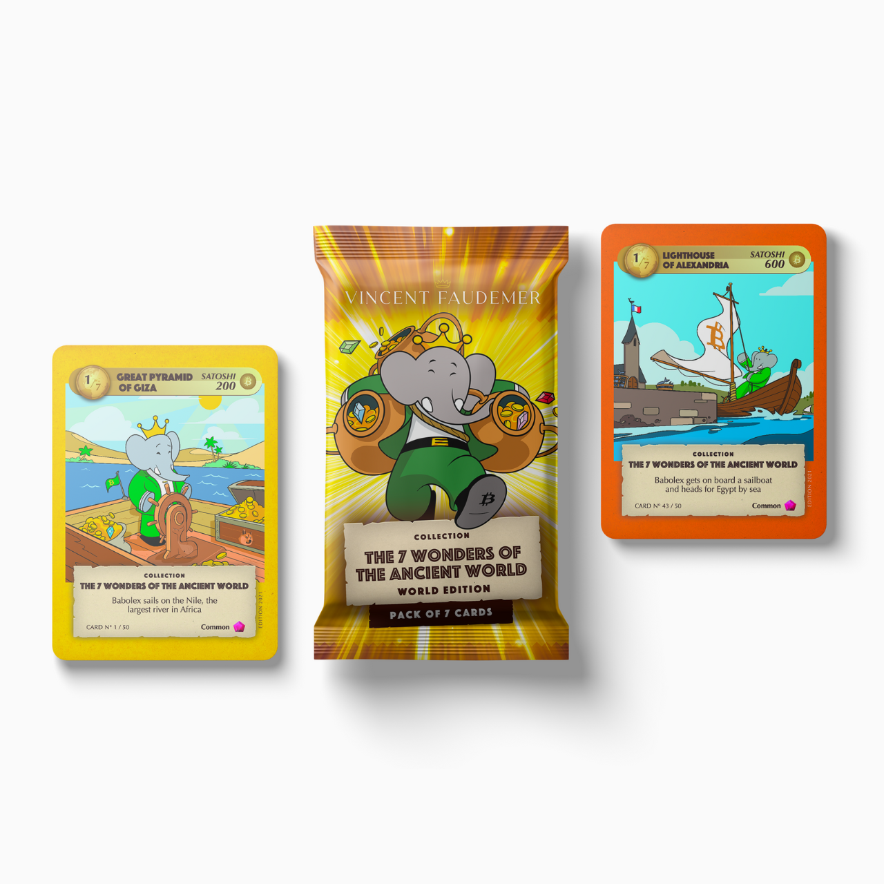 Achetez des boosters et commencez à collectionner les cartes Les 7 Merveilles du Monde Antique. Chaque pack contient 7 cartes authentifiées avec des valeurs Satoshi uniques.